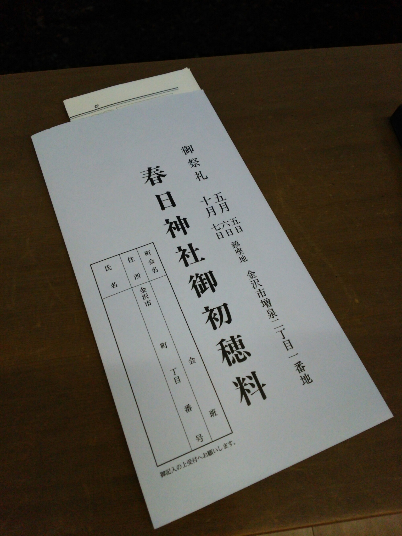 当日のお参りの際には、社頭に常備しております「春日神社御初穂料」袋を用い、ご住所お名前をご記入いただきまして、神社拝殿総代役員若しくは神社神職へ御奉納下さい。