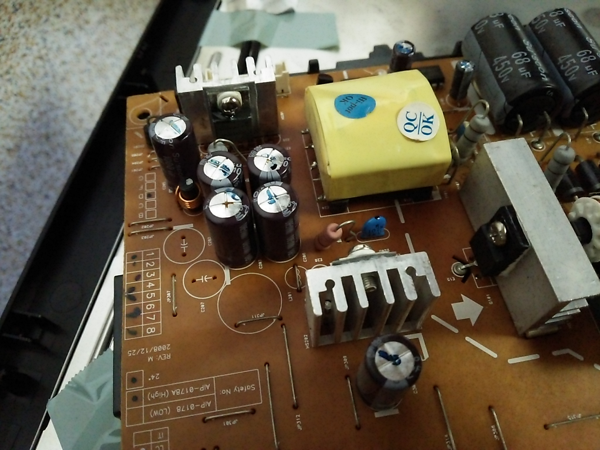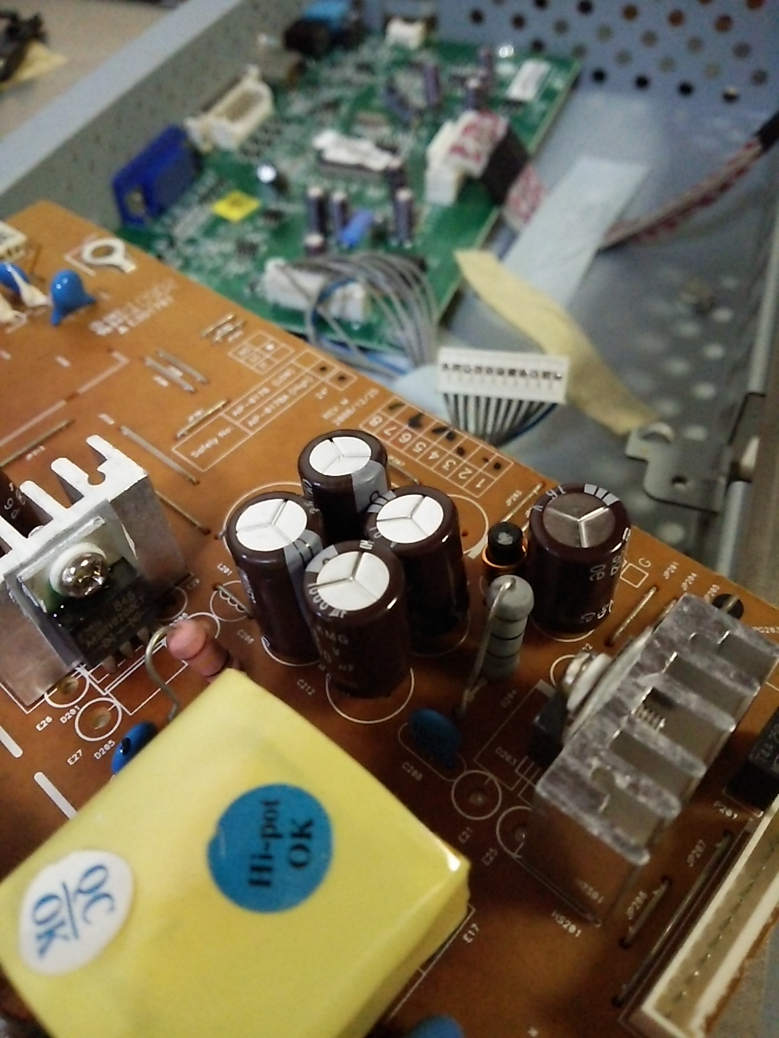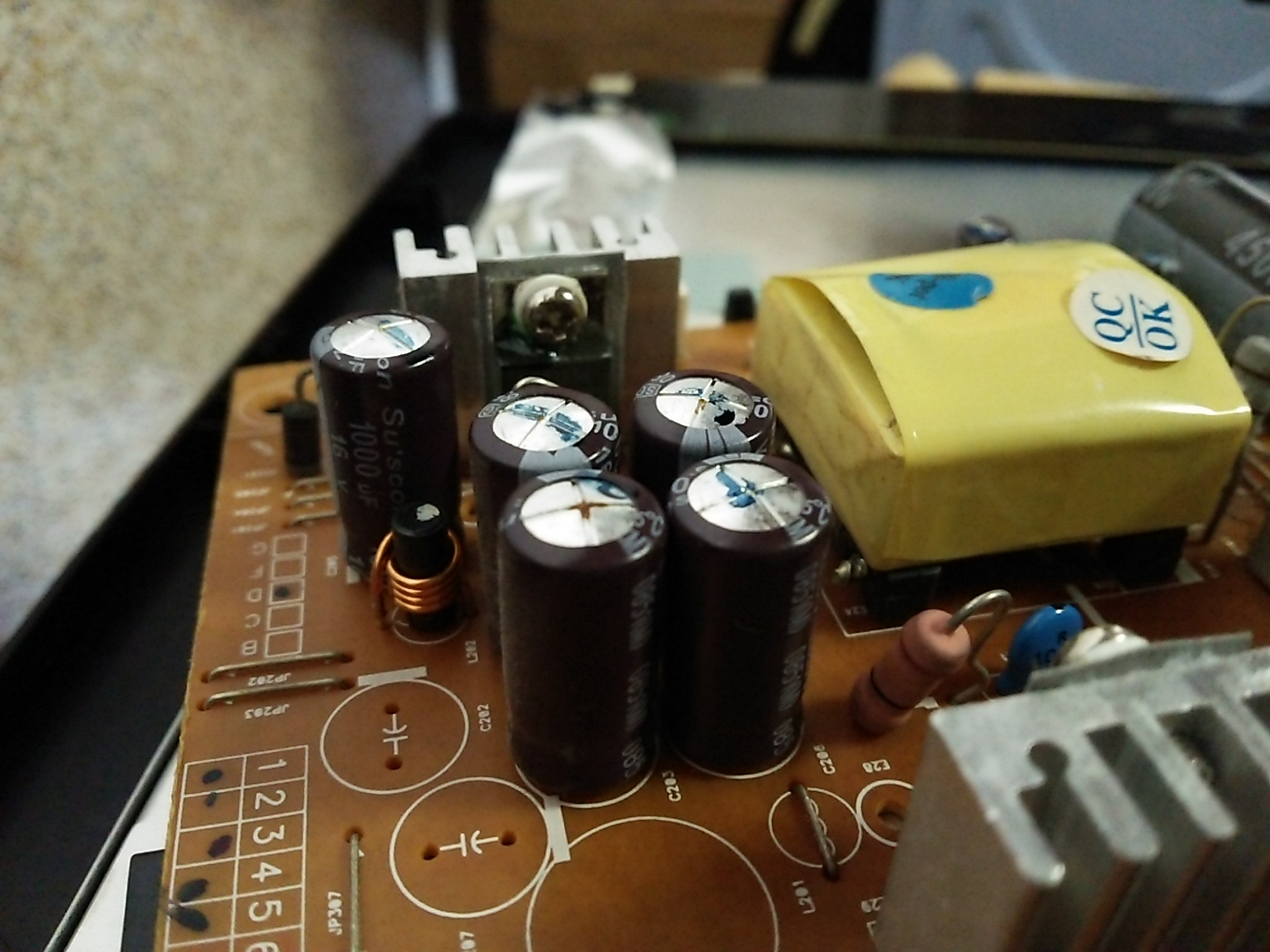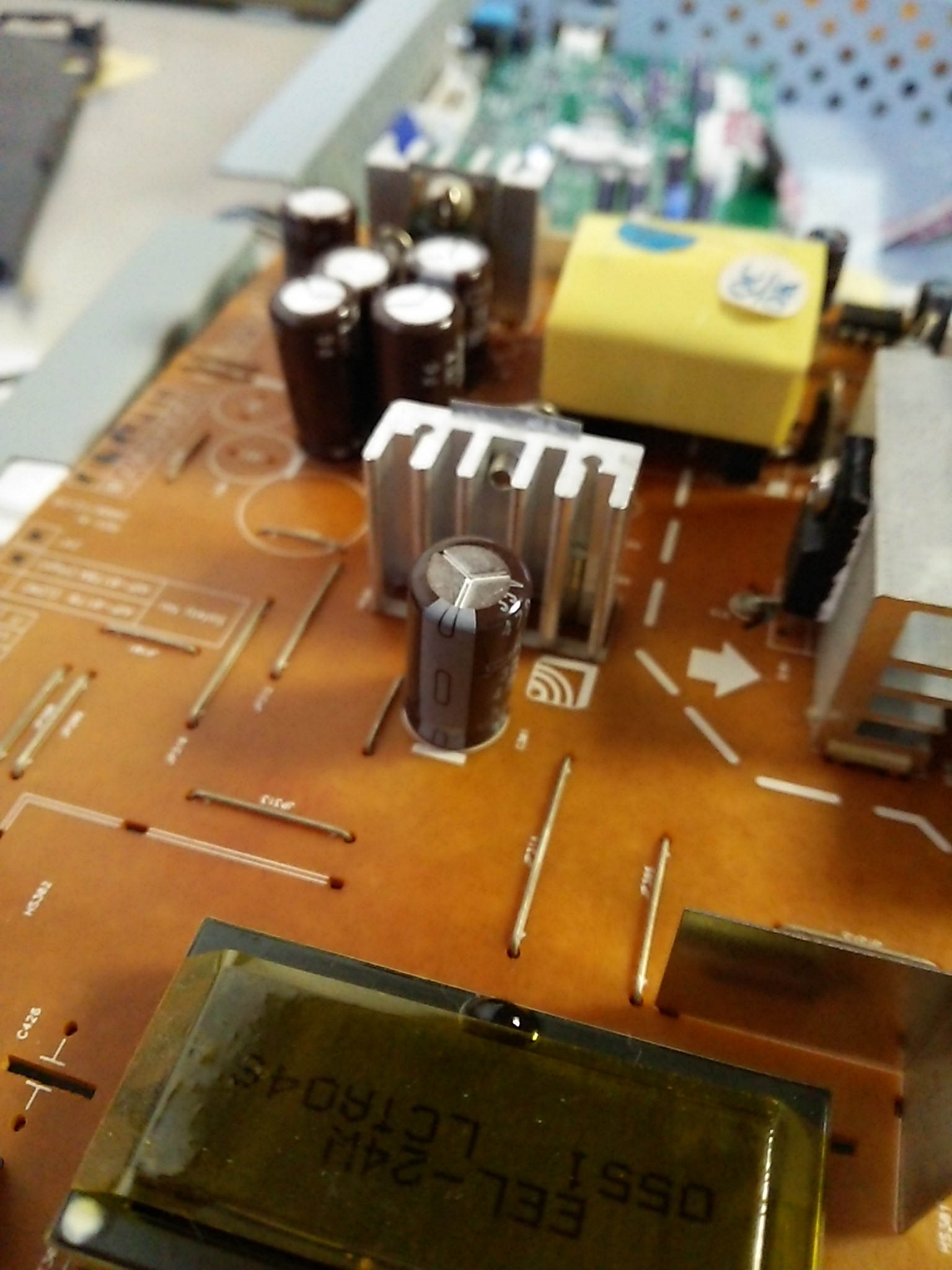 写真では分かりにくいかも知れませんが、五つのコンデンサーがその寿命を終えている事が分かります。(最近焦げ臭かったのはこの所為か…)