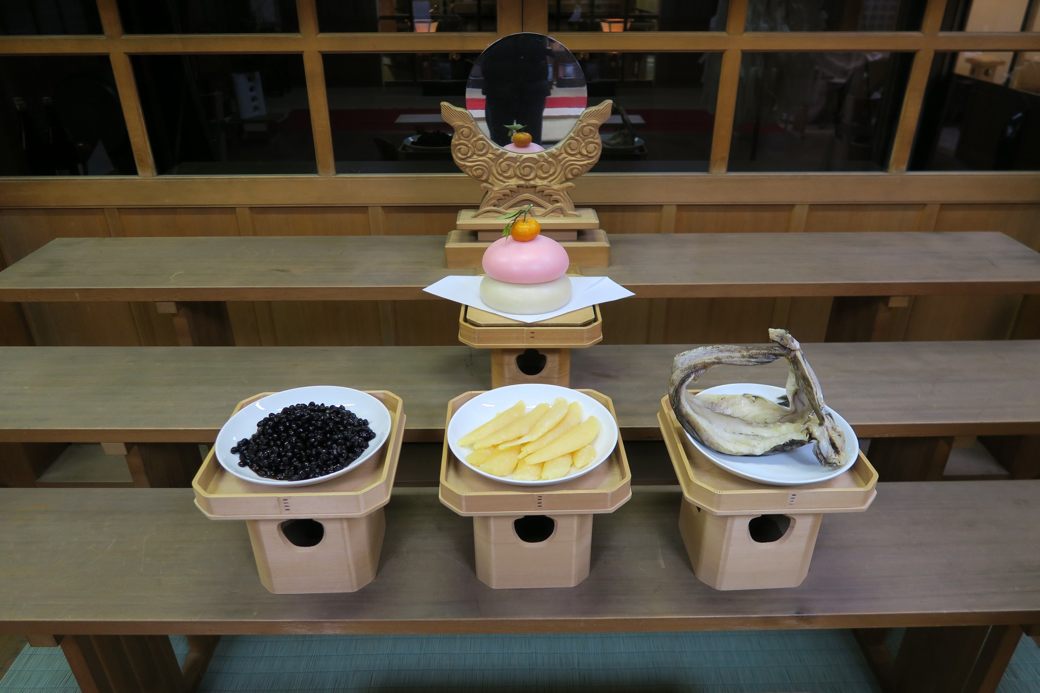 また春日神社の除夜祭のお供えは通常祭典とは異なり、写真の通り、数の子、棒鱈、黒豆(煮たもの)をお供えすることとなっております。