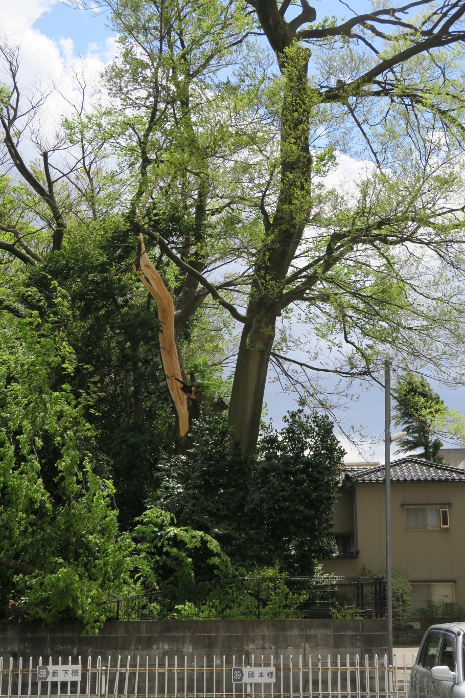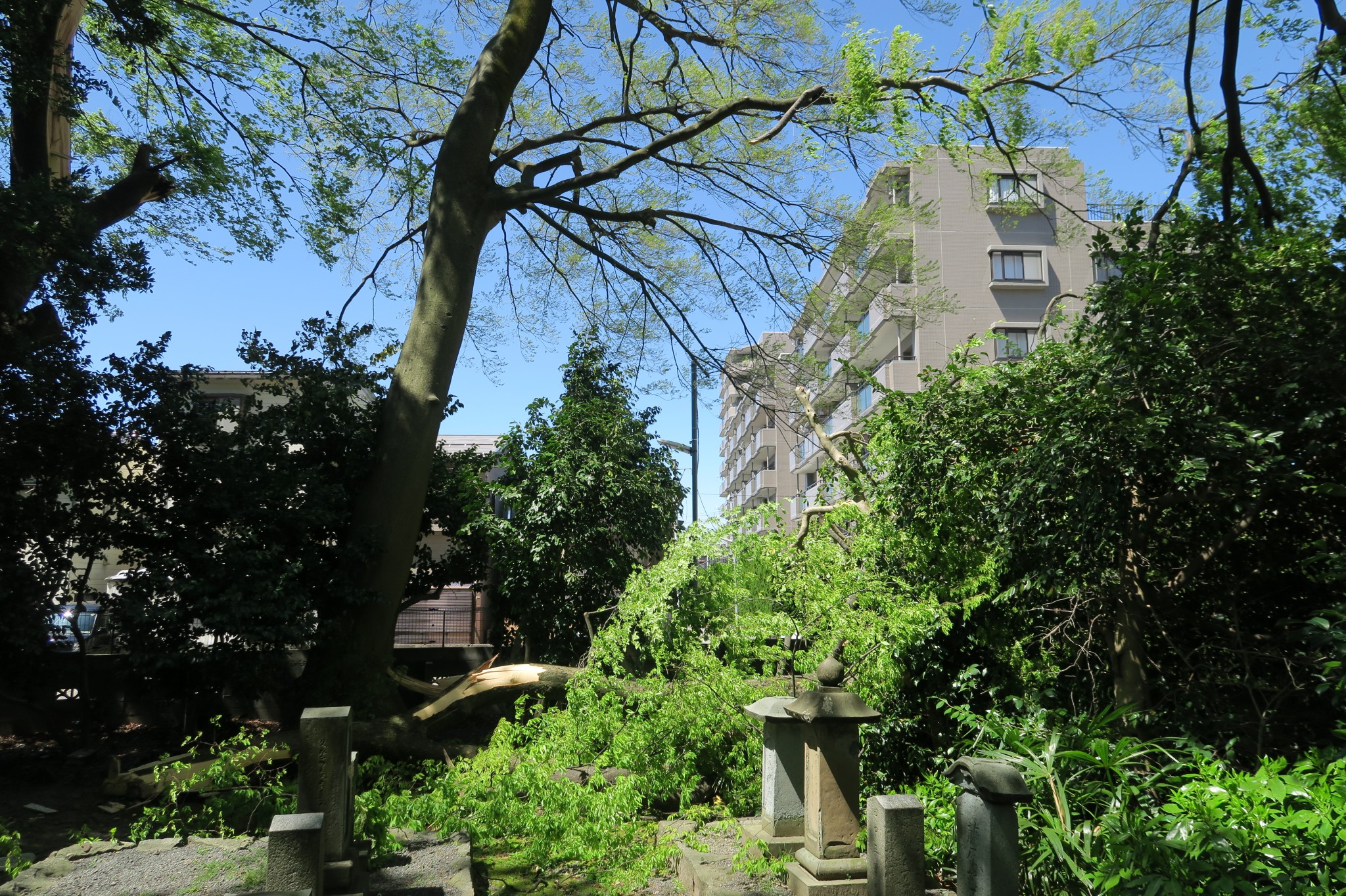 トーカンマンション側に倒れておりました、当神社の枝は、業者さんに入っていただきまして取り除かれました。