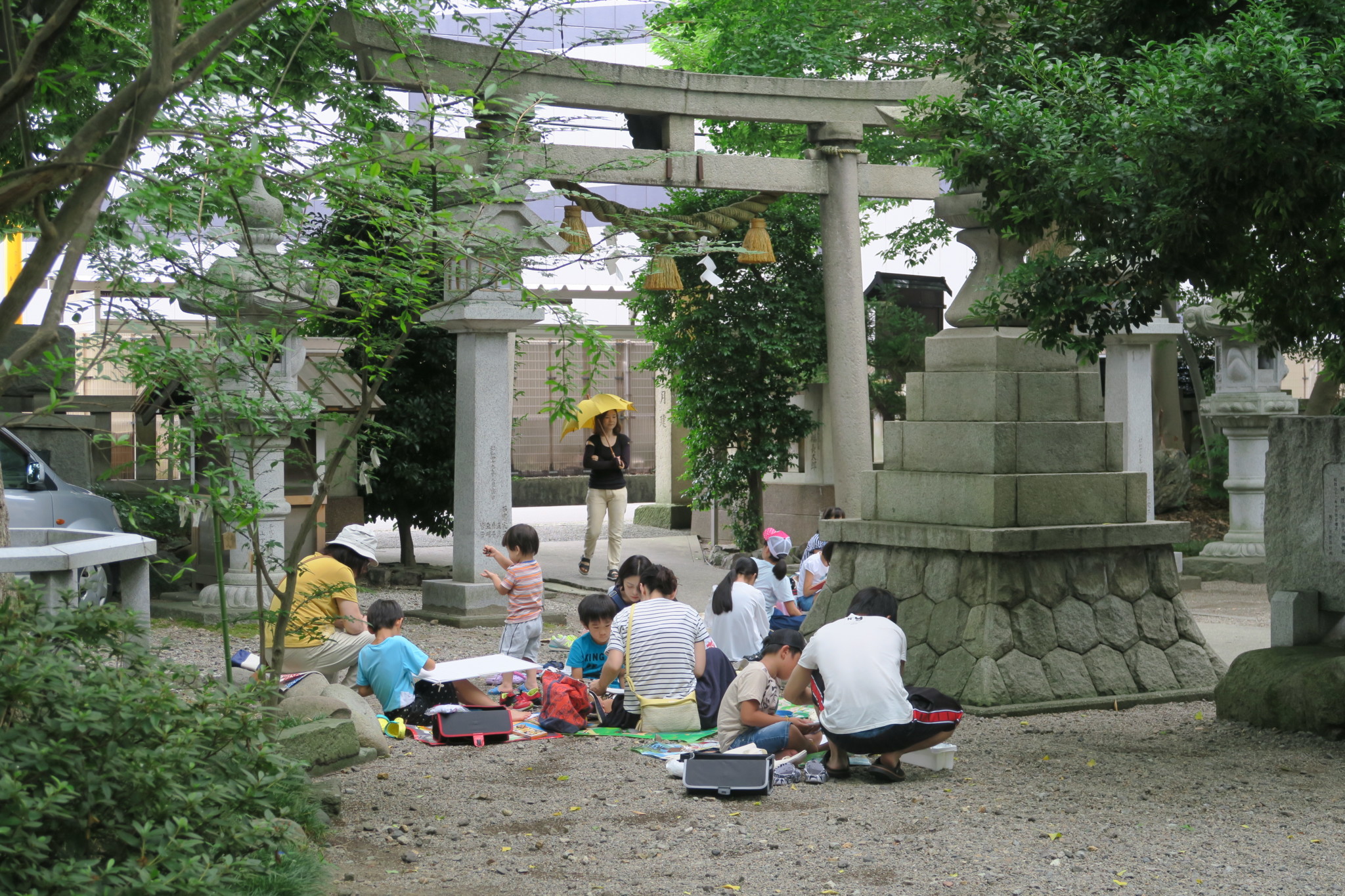 今年は熱中症対策にお茶の配布もしましたが、体調管理はたとえ保護者さんがそばに居たとしても難しいもので、絵を描くことに熱中している子供達は自分の体調変化にも気づきにくく、37℃などになるととてもとても境内で涼しく絵を描く状況ではなくなります。