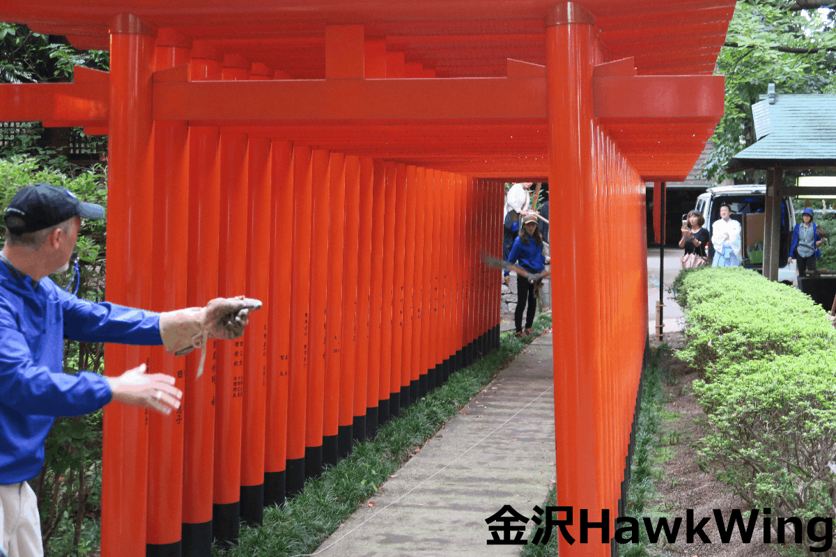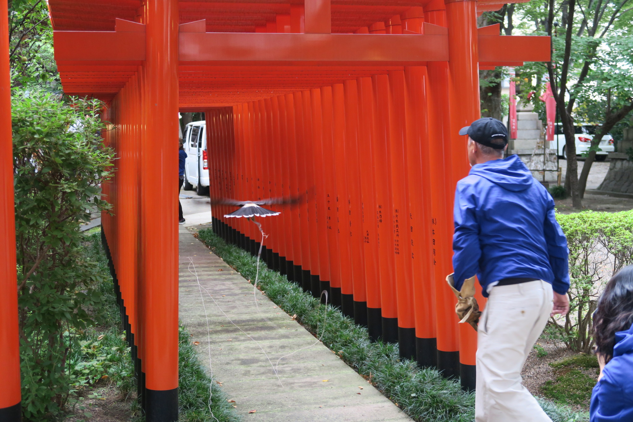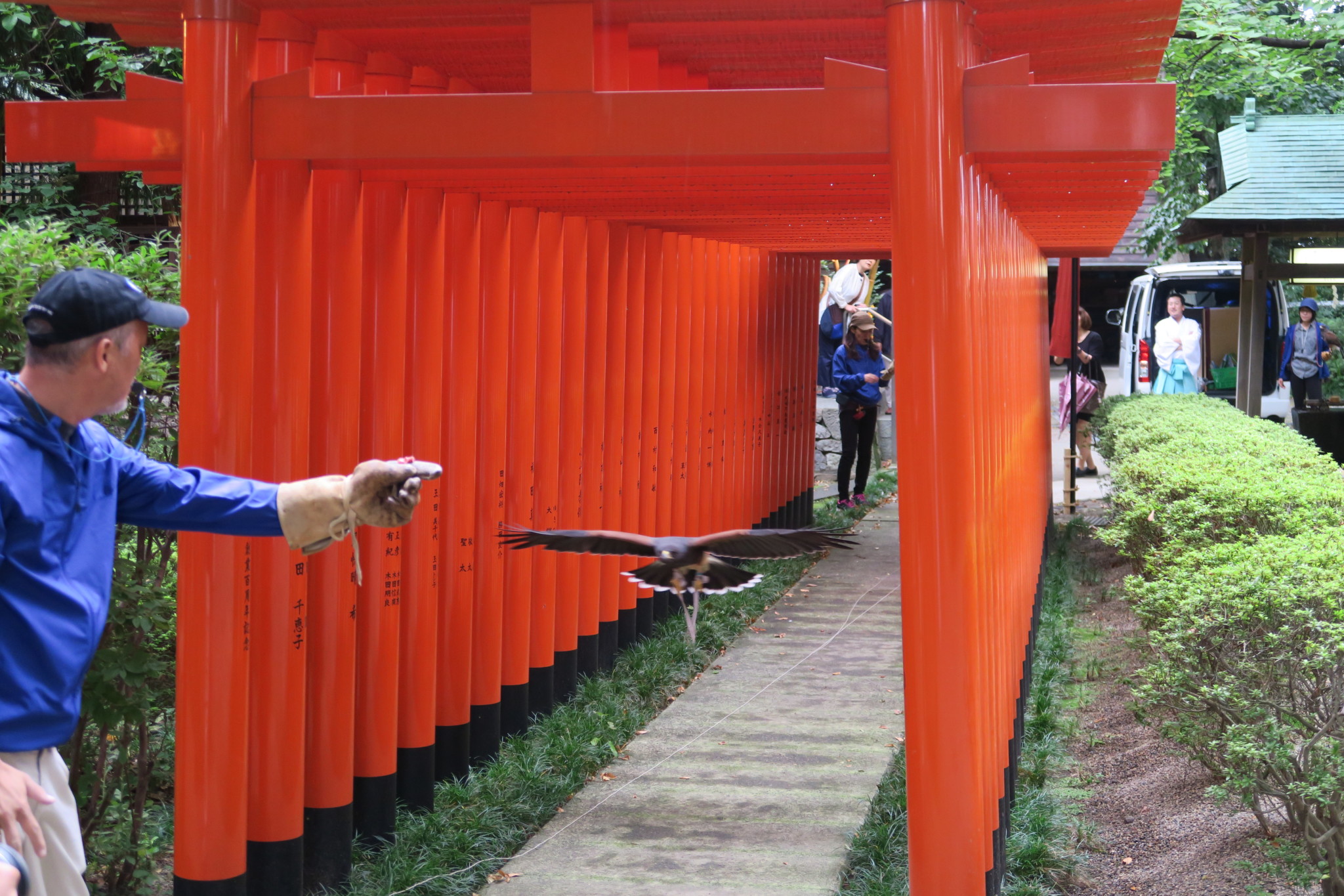 演じる鷹にしてみれば自分の体の大きさギリギリであろう赤鳥居群をくぐり抜けるのですから、飛び立つにも心構えが居るとされております。