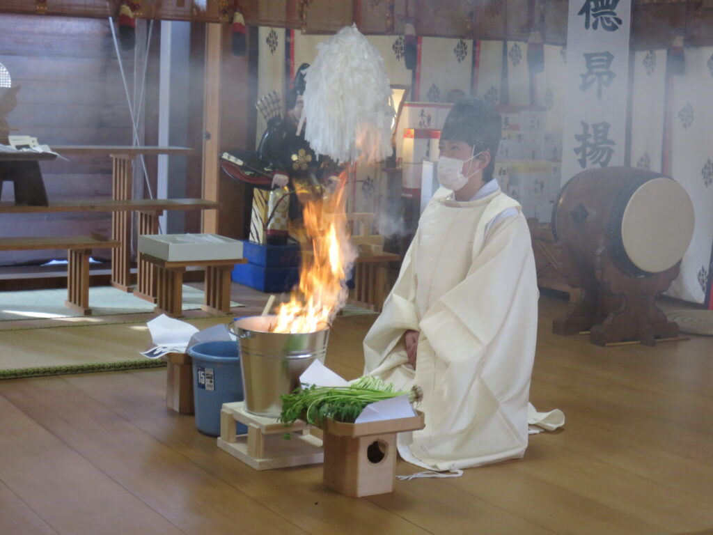 当神社境内に育つ、奈良の春日大社からお分け頂いた『春日杉』の葉を火種として燃える炎は、この季節白煙を伴い燃え盛りますが頃合いを見て宮司の手によりこれら3種の力添えをお借りして炎は消し止められます。